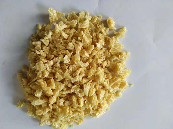 組織蛋白有粒狀、塊狀、片狀、絲狀等不同形態(tài),呈不同深淺的黃褐色,其網(wǎng)狀結(jié)構(gòu)成定向排列,形成具彈性、韌性的纖維束或積層,使在食用時有類似肉食肌肉組織的咬勁。典型的組織蛋白含蛋白質(zhì)60%左右??捎米鞣氯庵破返募±w維材料。