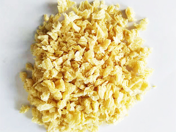 組織蛋白有粒狀、塊狀、片狀、絲狀等不同形態(tài),呈不同深淺的黃褐色,其網(wǎng)狀結(jié)構(gòu)成定向排列,形成具彈性、韌性的纖維束或積層,使在食用時(shí)有類似肉食肌肉組織的咬勁。典型的組織蛋白含蛋白質(zhì)60%左右??捎米鞣氯庵破返募±w維材料。
